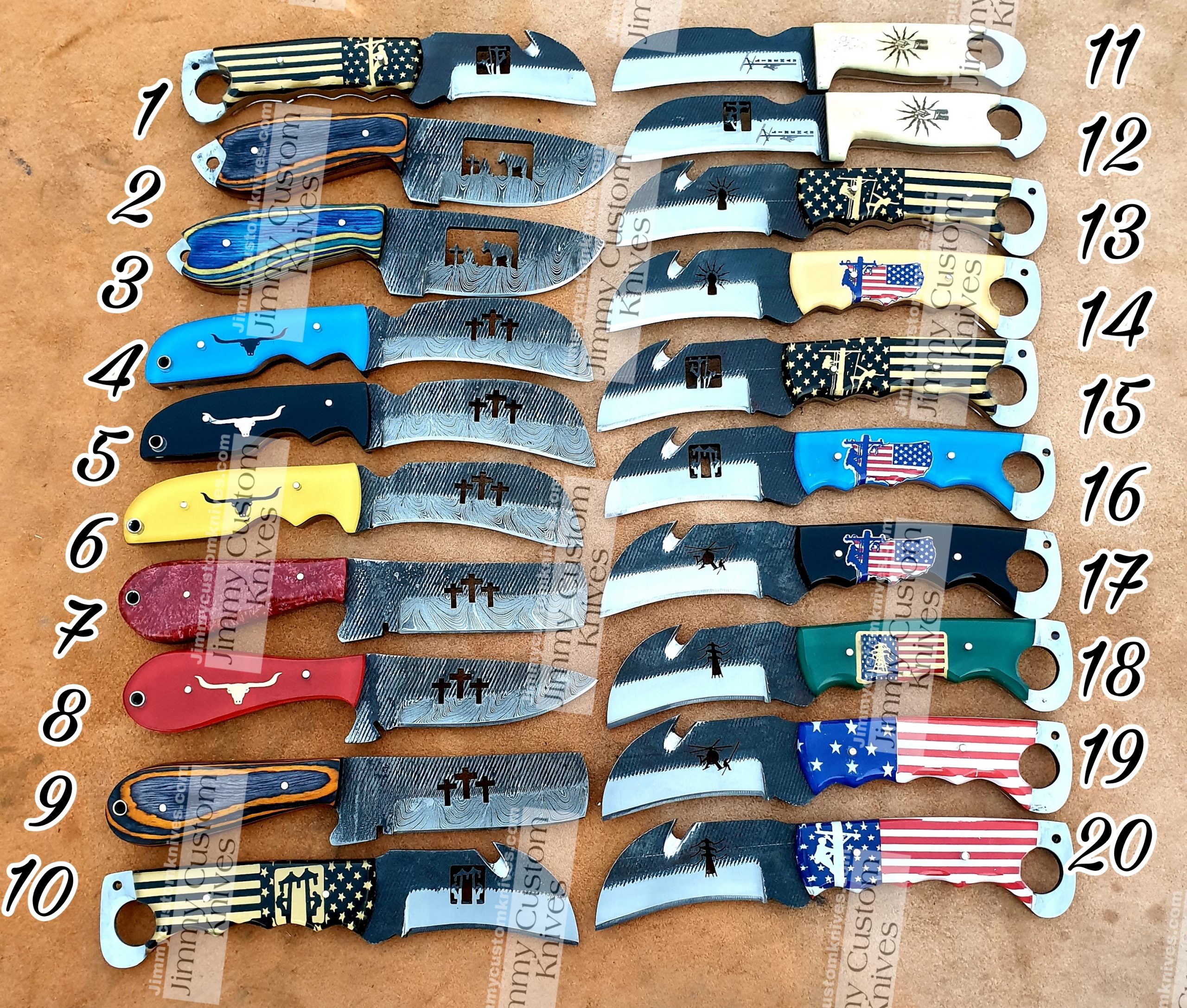 custom hand made Damascus steel cowboy and bull cutter and hawk bill knives.