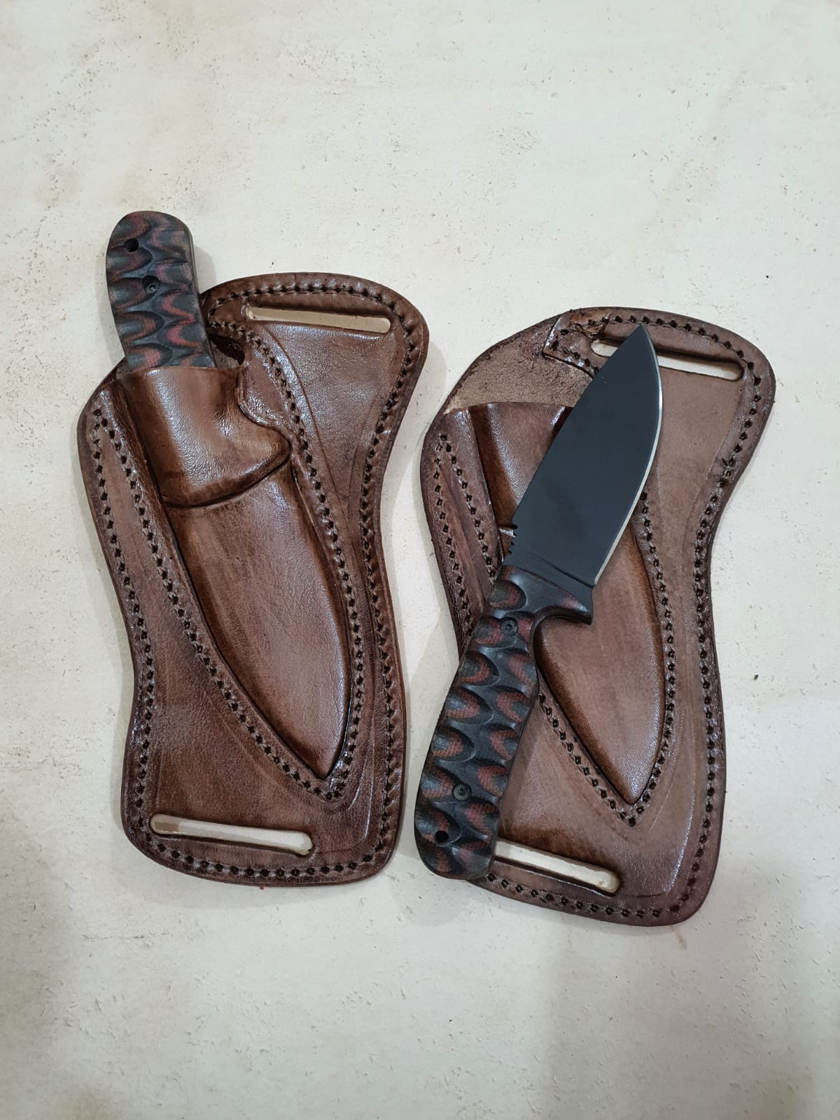 With cross draw leather sheath.