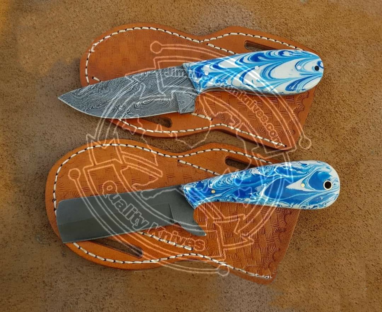 Custom Handmade Damascus and 1095 steel Skinner and bull cutter knives.Handles made of resin.overall lengths is 8"inches.also comes with cow Hide leather sheath.sharp edges and still long time...