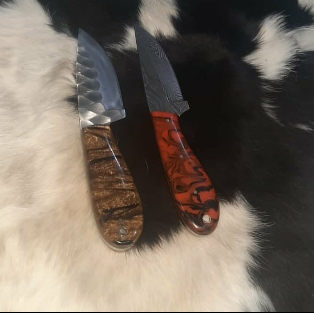 Custom Handmade Damascus and 1095 steel Skinner knives.Handle made of resin.overall lengths is 8"inches.also comes with cow Hide leather sheath.sharp edges and still long time...