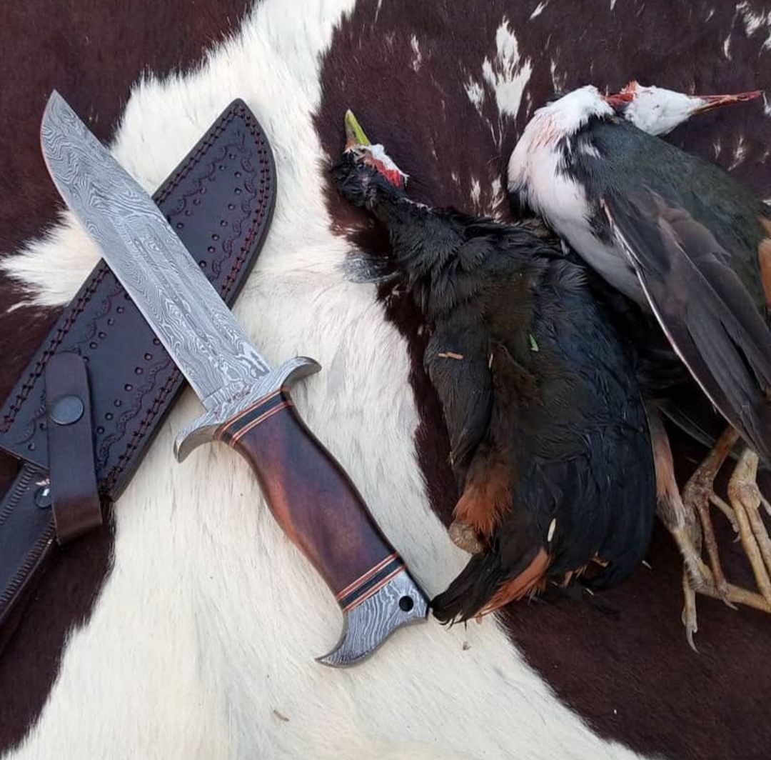 Custom Handmade Damascus steel Bowie knife.Handle made of Burl wood.overall length is 12"inches.also comes with cow Hide leather sheath.sharp edges and still long time...