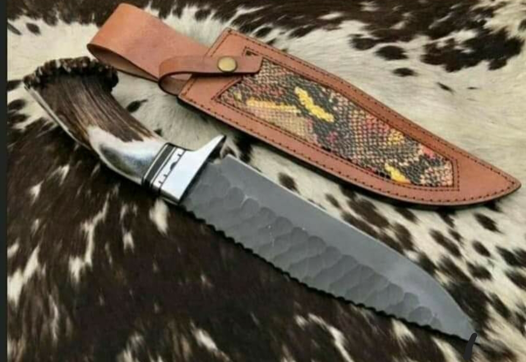 Custom Handmade 1095 steel Bowie knife.Handle made of Stag horn.overall length is 10"inches.also comes with leather sheath.sharp edges and still long time...