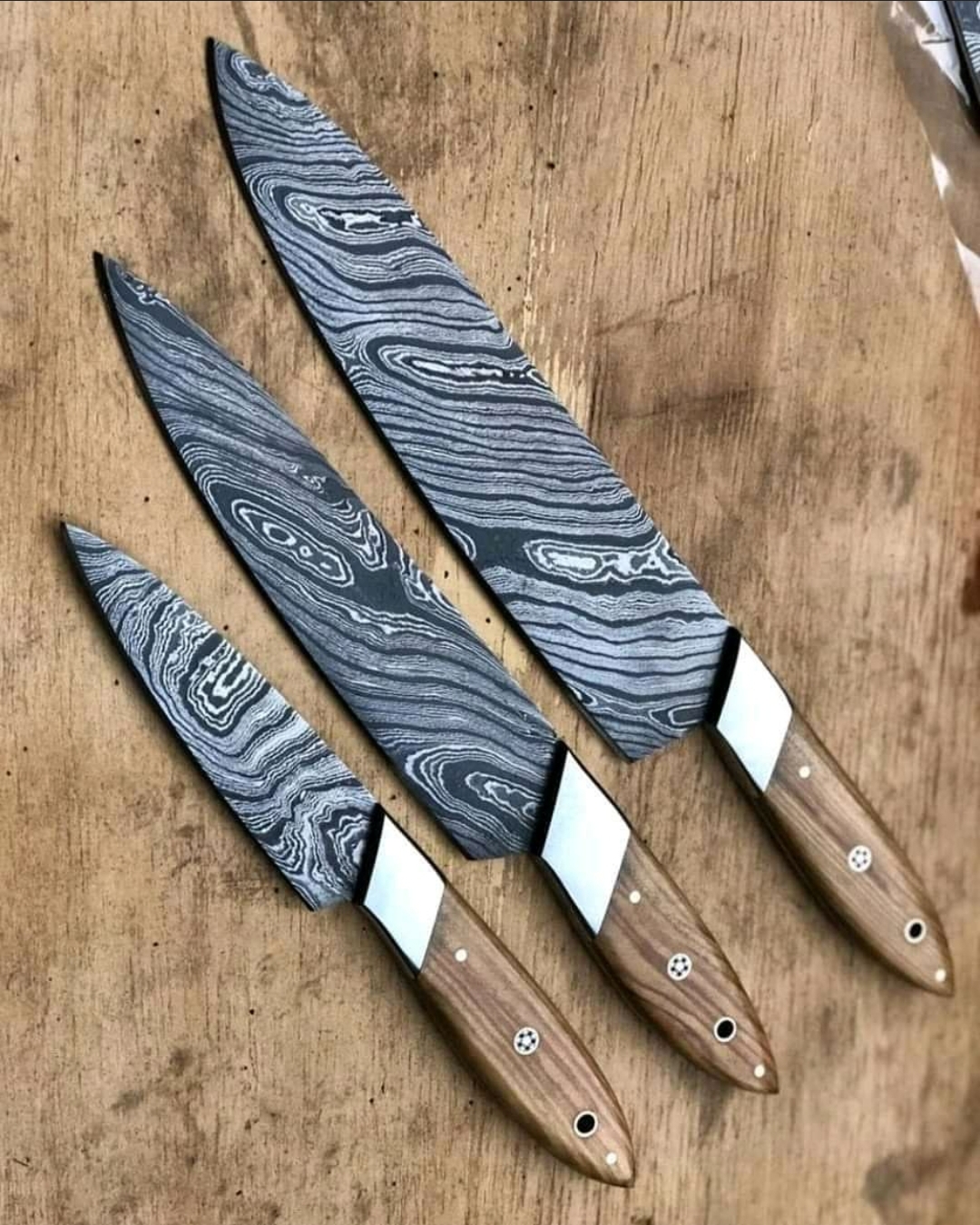 Custom Handmade Damascus steel chef set knives.Handles made of Burl wood.overall lengths is "9to14" inches.also comes with leather bag.sharp edges and still long time...