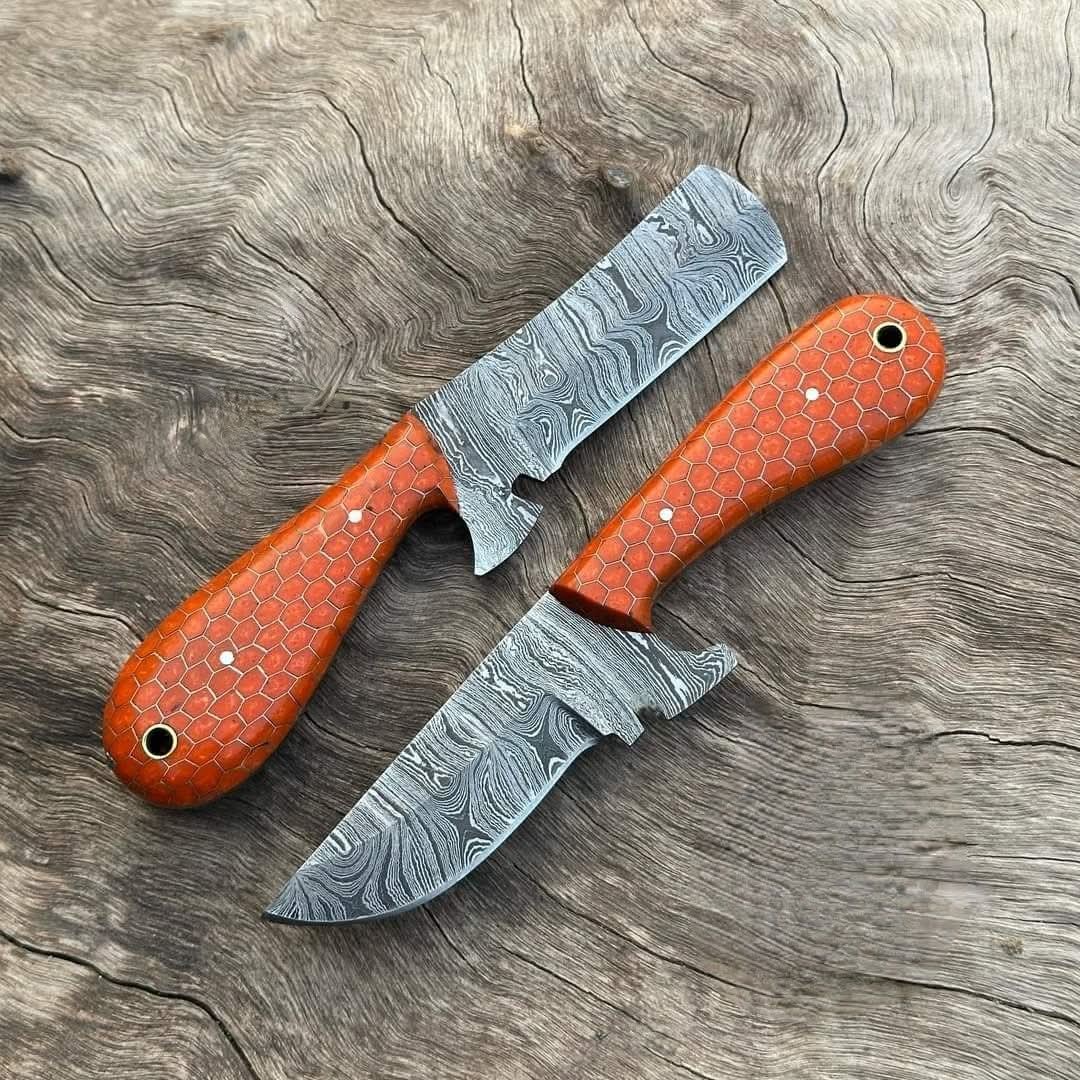 Custom handmade Damascus steel cowboy skinner bull cutter knives.