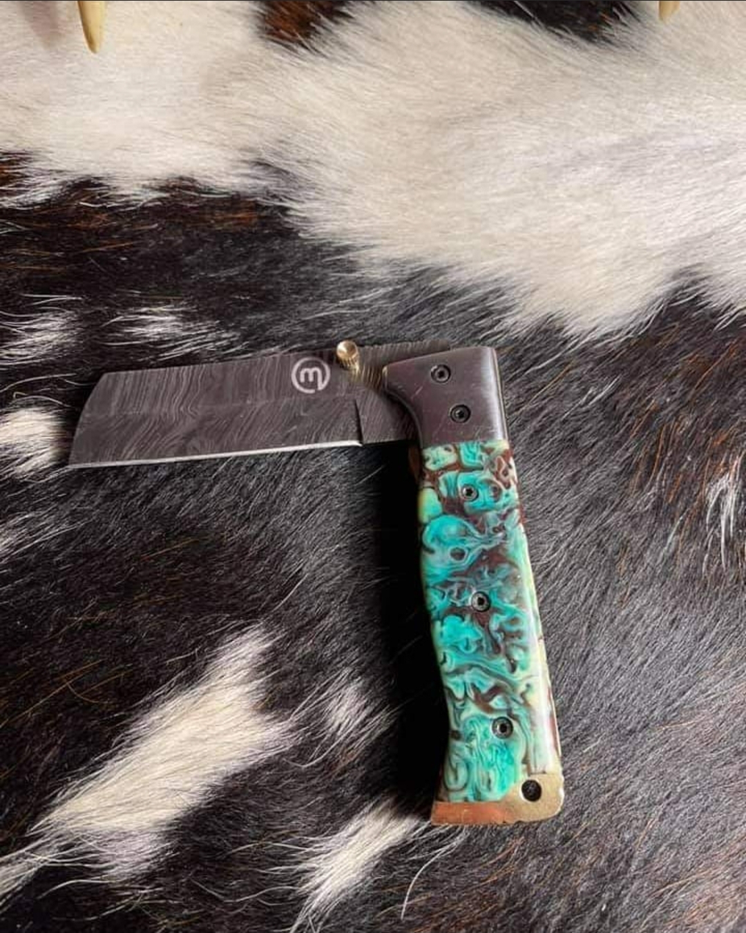 Custom Handmade Damascus steel folding knife.Handle made of Resin.overall length is 10"inches.also comes with cow Hide leather sheath.sharp edges and still long time...