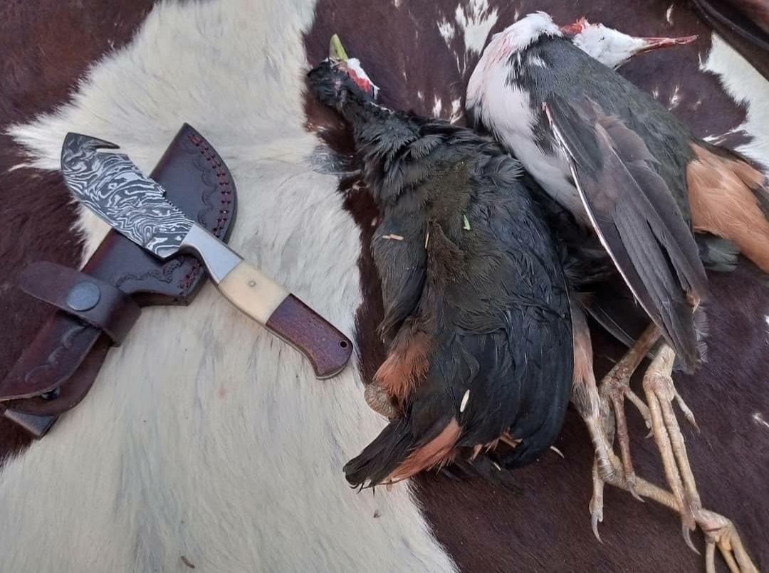 Custom Handmade Damascus steel Gut hook knife.Handle made of Camel bone and wood.overall length is 8"inches.also comes with cow Hide leather sheath.sharp edges and still long time...