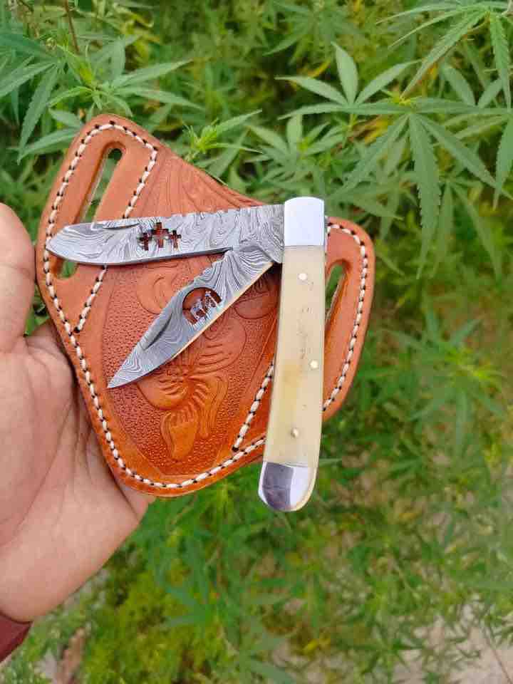 Hi guys for sale custom hand made Damascus steel cowboy pocket knife.