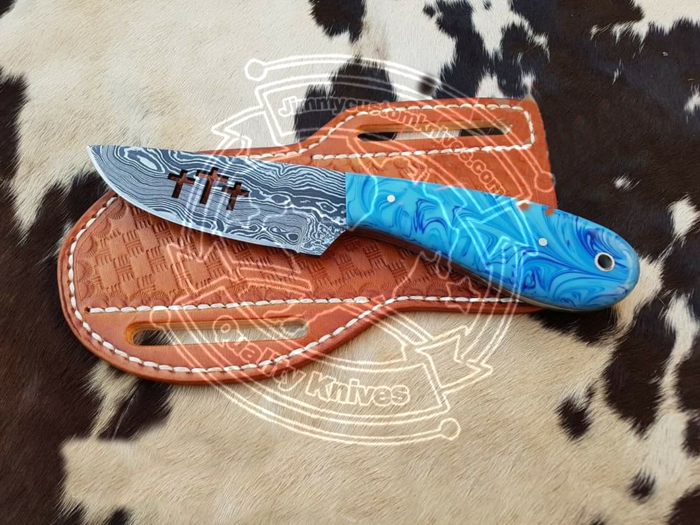 Custom Handmade Damascus steel Skinner knife.Handle made of resin.overall length is 8"inches.also comes with cow Hide leather sheath.sharp edges and still long time...