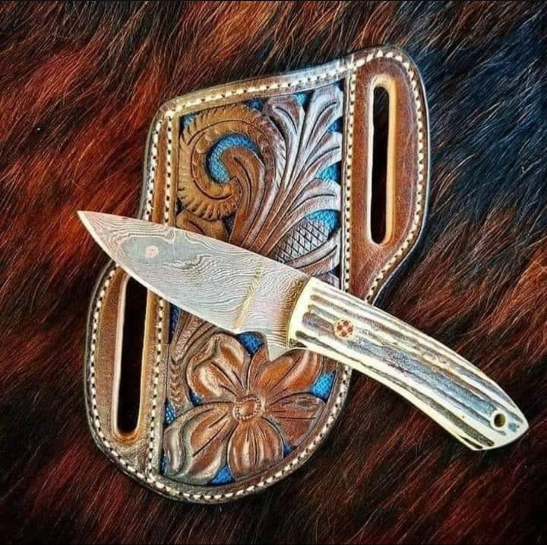 Custom Handmade Damascus steel Skinner knife.Handle made of Stag horn.overall length is 8"inches.also comes with cow Hide leather sheath.sharp edges and still long time...
