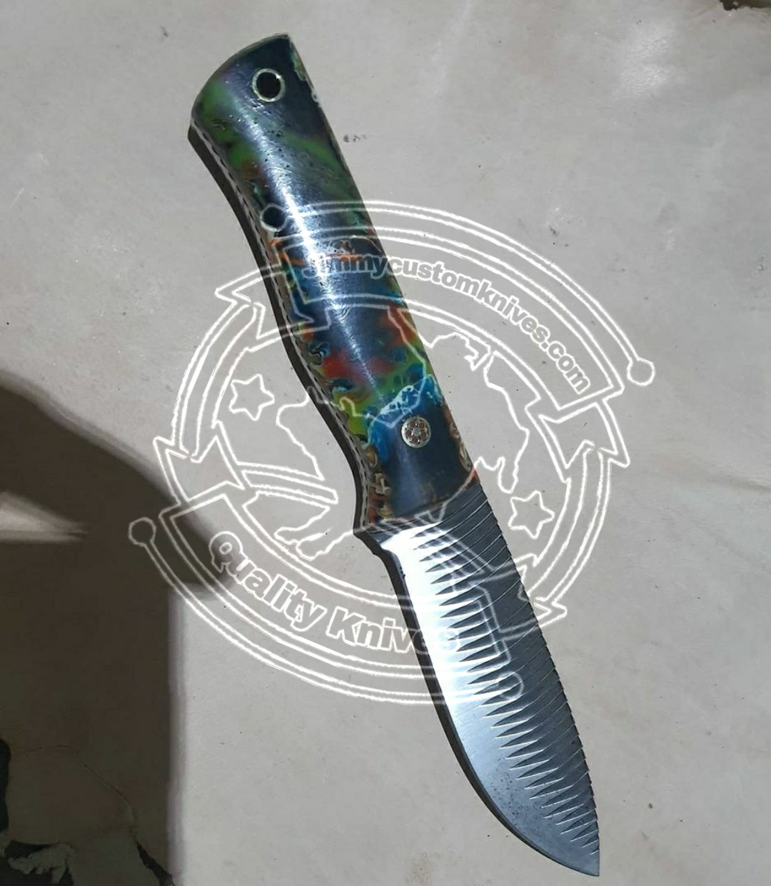 Custom Handmade rasp steel Skinner knife.Handle made of Resin.overall length is 8"inches.also comes with cow Hide leather sheath.sharp edges and still long time...