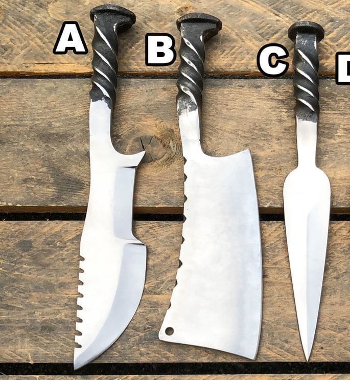 Custom knives set made from a light-gauge rail spike. Spike head is formed into a skull. Overall length: 10″. Blade length: 4.5″. Handmade leather sheath.